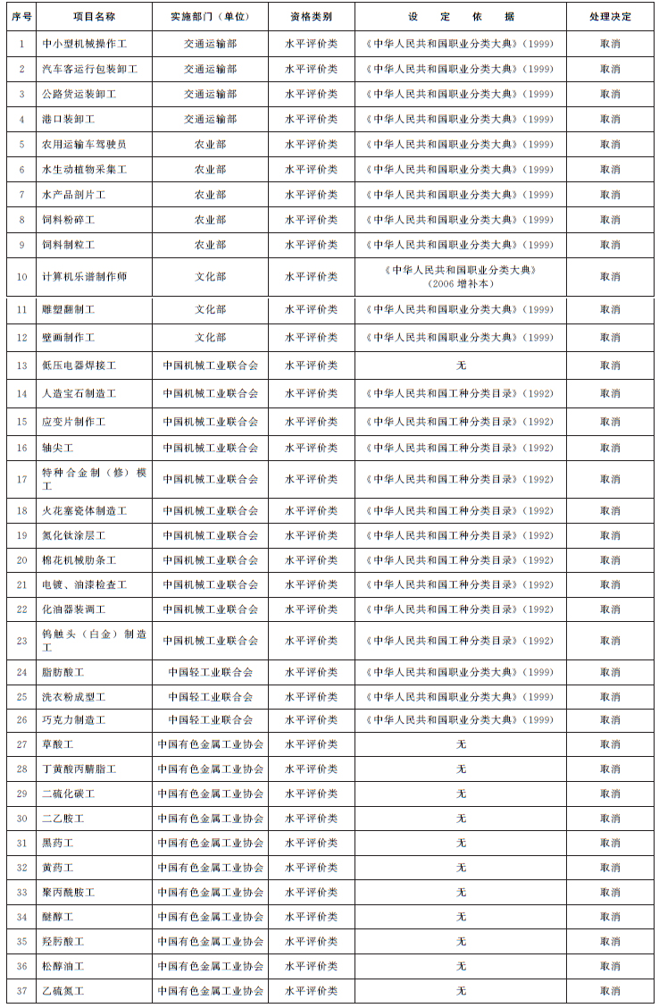 二、取消的技能人员职业资格许可和认定事项