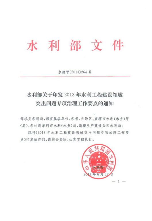 水利部ob欧宝中国(中国)网站首页印发2013年水利工程建设领域突出问题专项治理工作要点的通知