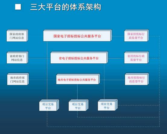 根据我国目前招标投标行政监督体制,全国电子招标投标信息公共服务平台体系共有国家、省、市三个层级的平台构成,其主要服务功能: