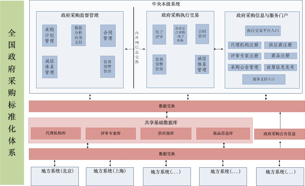 财库[2013]18号 各省、自治区、直辖市、计划单列市财政厅(局),新疆生产建设兵团财务局,中央国家机关政府采购中心,中共中央直属机关采购中心,全国人大机关采购中心: 现将《全国政府采购管理交易系统建设总体规划》和《政府采购业务基础数据规范》印发给你们,请遵照执行。 附件:1.全国政府采购管理交易系统建设总体规划 2.政府采购业务基础数据规范 财 政 部 2013年1月31日 附件1: 全国政府采购管理交易系统建设总体规划 加强政府采购信息化建设是深化政府采购制度改革的重要内容,也是实现政府采购科学化精细化管理的重要手段。按照2012年3月国务院召开的第五次廉政工作会议ob欧宝中国(中国)网站首页“加快建设全国统一的电子化政府采购管理交易平台”的工作要求,为切实加强对全国政府采购信息化建设工作的统一领导和组织实施,根据《中华人民共和国政府采购法》及相关法规制度规定、《“十二五”时期财政信息化建设规划》,制定本规划。 一、指导思想和工作原则 (一)指导思想 全国政府采购管理交易系统建设要以科学发展观为指导,围绕经济发展和财政改革的大局,坚持“统一领导、统一规划、统一标准、统一平台”的指导思想,本着“高起点设计、高技术标准、高灵活扩展、高程度兼容、高安全运行”的建设思路,统筹规划、突出重点、点面结合、协调推进,以信息化技术为支撑,全面提高政府采购科学化精细化管理水平,实现政府采购监督管理与执行交易各环节的协调联动,推动政府采购制度改革健康有序、深入持续发展。 (二)工作原则 1.统筹规划,分步实施。全国政府采购管理交易系统建设涉及面广,工作量大,既要避免重复建设造成浪费,又要防止信息孤岛和技术壁垒分割市场。为确保系统建设的有序性,财政部负责统筹规划全国政府采购管理交易系统建设的总体目标、基本框架、建设内容、主要功能和技术规范,做好顶层设计,统一组织系统建设工作,先易后难,分步推进,逐步完善。 2.统一标准,分级建设。统一标准是互通互联、信息共享、业务协同的基础。信息化建设必须有标准化的支持,尤其要发挥标准化的导向作用,以确保技术上的协调一致和整体工作效能的提高。全国统一的政府采购标准化体系是政府采购系统建设的着眼点、出发点和立足点,中央和省级财政部门按照统一标准对系统实行分级建设、管理和维护,达到上下贯通、纵横相联、内外兼顾,实现全国“一盘棋”。 3.统一平台,分别使用。全国政府采购管理交易系统建设要体现政府采购监督管理和执行交易的有机统一,将监督管理的职能贯穿到政府采购工作的全流程中,在执行交易中体现监督管理思想。系统建设要以财政部门为主导,充分吸收各方需求,建立一体化的监督管理和执行交易业务处理平台,实现政府采购监管部门、采购人、集中采购机构、社会代理机构、供应商、评审专家等多方用户按权限对平台的分别使用。 4.规范建设,注重安全。全国政府采购管理交易系统覆盖范围广、业务流程复杂、数据量大、信息交换频繁,对信息安全具有很高的要求。系统建设要严格遵循信息系统建设、管理、使用、维护的相关国家标准,遵守财政信息化安全建设相关规定,坚持建设与管理并重,通过规范系统建设、执行相关安全管理制度、运用先进技术手段,确保系统安全可靠、持续稳定运行。同时,加强安全保密监督检查工作,确保信息安全。 二、系统建设目标 全国政府采购管理交易系统建设要以“功能完善、资源共享、规范透明、安全高效”为总体目标,建成中央与地方系统相对独立运行、全国基础数据统一集中共享的大型网络化信息管理系统,不断提高政府采购工作质量和效率,促进政府采购管理科学化精细化。具体包括五大功能: (一)信息服务功能。以政府采购信息服务门户网站为载体,向社会公开政府采购政策法规、招标投标以及供应商及商品、评审专家、代理机构等相关信息记录。通过“一站式”信息聚合和检索,为社会公众获取政府采购信息提供优质、方便、快捷的服务,增强政府采购透明度,便于社会各界对政府采购工作的有效监督。 (二)监督管理功能。通过运用政府采购监督管理平台,为政府采购监管部门及其他相关部门提供全面的监督管理功能。科学设计管理流程、控制节点,建立严密的系统内控机制以及与执行交易平台的协调互动,实现政府采购业务从预算管理到采购计划、采购实施、方式变更、合同管理、统计分析、诚信体系等全流程电子化管理,实现对监督管理、执行交易重点环节和关键业务的实时监控和自动预警。 (三)电子交易功能。通过运用政府采购执行交易平台和全国共享基础数据库,为各采购主体提供安全高效的全流程电子化业务操作功能。采购人可通过网上电子竞价、实时价格比较的方式采购货物及服务,采购机构可对采购项目进行严格管理并实行电子化评审,供应商可一地注册、全国各地参与采购活动,评审专家可实行电子评标及跨区域评标。相关执行交易信息可实时传入政府采购监督管理平台。 (四)决策支持功能。通过建立分析预测、监测预警、政策分析等数据模型,结合宏观经济数据,科学分析政府采购发展趋势,为深化政府采购制度改革、更好地实现政府采购政策功能以及财政宏观经济调控提供决策依